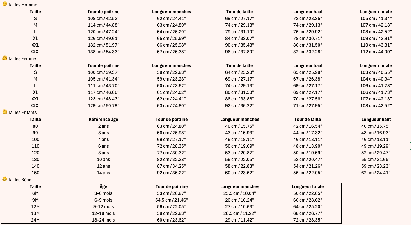 Pour composer un set complet (enfant + maman + papa), ajoutez simplement chaque taille au panier.