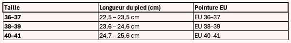 La coupe est petite : nous recommandons de choisir 1 à 2 tailles au-dessus pour un confort optimal, surtout si votre pied est large.