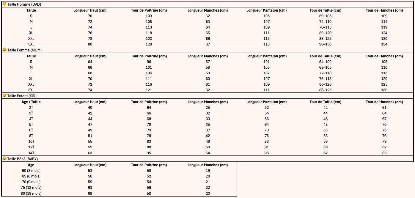 Pour composer un set complet (enfant + maman + papa), il suffit d’ajouter chaque taille séparément au panier.